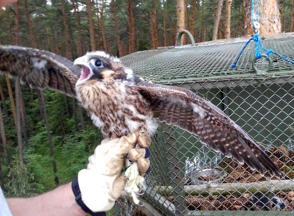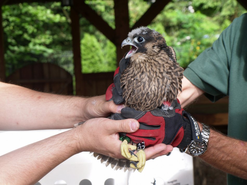 Sokół wędrowny to jeden z najrzadszych gatunków w Polsce. Nadrzewna populacja europejska tego ptaka drapieżnego całkowicie wyginęła w latach 60-tych. Przyczyniło się do tego m.in. zatrucie środowiska szkodliwą chemią: pestycydem DDT. Sokoły spędzą w sztucznych gniazdach zawieszonych w koronach drzew około 10 dni. Służy to przyzwyczajeniu ich do tego miejsca. Gniazda zostaną otwarte, gdy ptaki będą gotowe do pierwszego lotu. Potem jeszcze przez co najmniej miesiąc będą dokarmiane. Sokoły po osiągnięciu dojrzałości (w wieku około 2-3 lat) założą gniazda w żmigrodzkich lasach. Uznają je bowiem za teren swojego urodzenia.