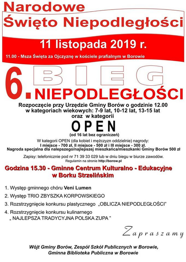 Drugi bieg wystartuje w Borowie również 11 listopada br. i będzie to VI Gminny Bieg Niepodległości odbędzie się w czterech kategoriach wiekowych na czterech dystansach. Najmłodsi (dzieci w wieku 7-9 lat) pobiegną na dystansie ok. 320 m, nieco starsi (10-12 lat) wystartują na dystansie ok. 800 m, a ok. 1,4 km będą mieli do przebiegnięcia zawodnicy w wieku 13-15 lat. Bieg główny odbędzie się na dystansie ok. 5,1 km. Start i metę wszystkich biegów wyznaczono przed Urzędem Gminy Borów na ul. Konstytucji 3 Maja. Biuro zawodów, na placu przed urzędem gminy, zostanie otwarte o godz. 9.00, a do biegów będzie można zgłaszać się do godz. 12.20. Najmłodsi wystartują jako pierwsi o godz. 12.15, a bieg główny ruszy o godz. 13.00.