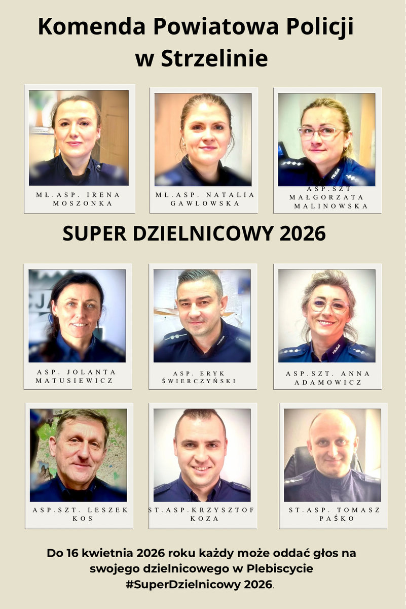 Od 16.02.2026 r., można oddawać głosy na swojego dzielnicowego! Komenda Główna Policji, Telewizja Puls oraz ekipa serialu kryminalnego „Dzielnica strachu” wkraczają do akcji i po raz czwarty, w ramach kampanii społecznej #DzielnicaBEZstrachu, prowadzą internetowy plebiscyt, którego celem jest promowanie bezpieczeństwa i współpracy lokalnych społeczności z dzielnicowymi oraz wyłonienie #SuperDzielnicowego 2026. W tym roku Plebiscyt odbywa się w świetle szczególnej rocznicy, jaką jest 100 lat służby dzielnicowych w Polsce.